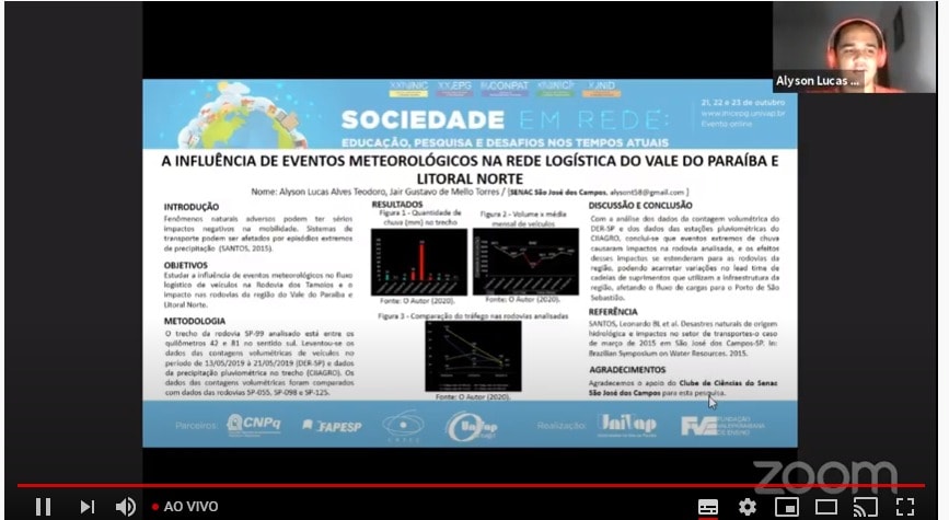 No evento, Alyson Lucas, aluno do Senac de São José dos Campos, orientado pelo Professor Jair Gustavo de Mello Torres, apresentou um trabalho sobre a Rodovia dos Tamoios. O foco da pesquisa foi analisar a influência de eventos meteorológicos no fluxo logístico de veículos na rodovia e o impacto nas rodovias da Região Metropolitana do Vale do Paraíba e Litoral Norte.