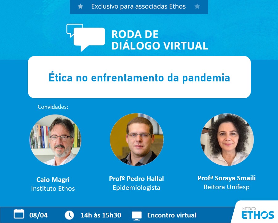 Nessa quinta-feira (08), o Instituto Ethos realizou a palestra “Ética no Enfrentamento da Pandemia”, abordando os aprendizados desses últimos 12 meses e as perspectivas futuras no contexto da crise. Foram trazidos dados do Brasil e do mundo em relação às testagens, políticas de isolamento, países com menor números de casos, tipos de máscara e vacinação. O evento foi aberto por Caio Magri – Presidente do Instituto, que, após destacar a importância da ciência e da pesquisa no enfrentamento da pandemia, passou a palavra para os palestrantes Soraya Soubhi Smaili e Pedro Hallal.