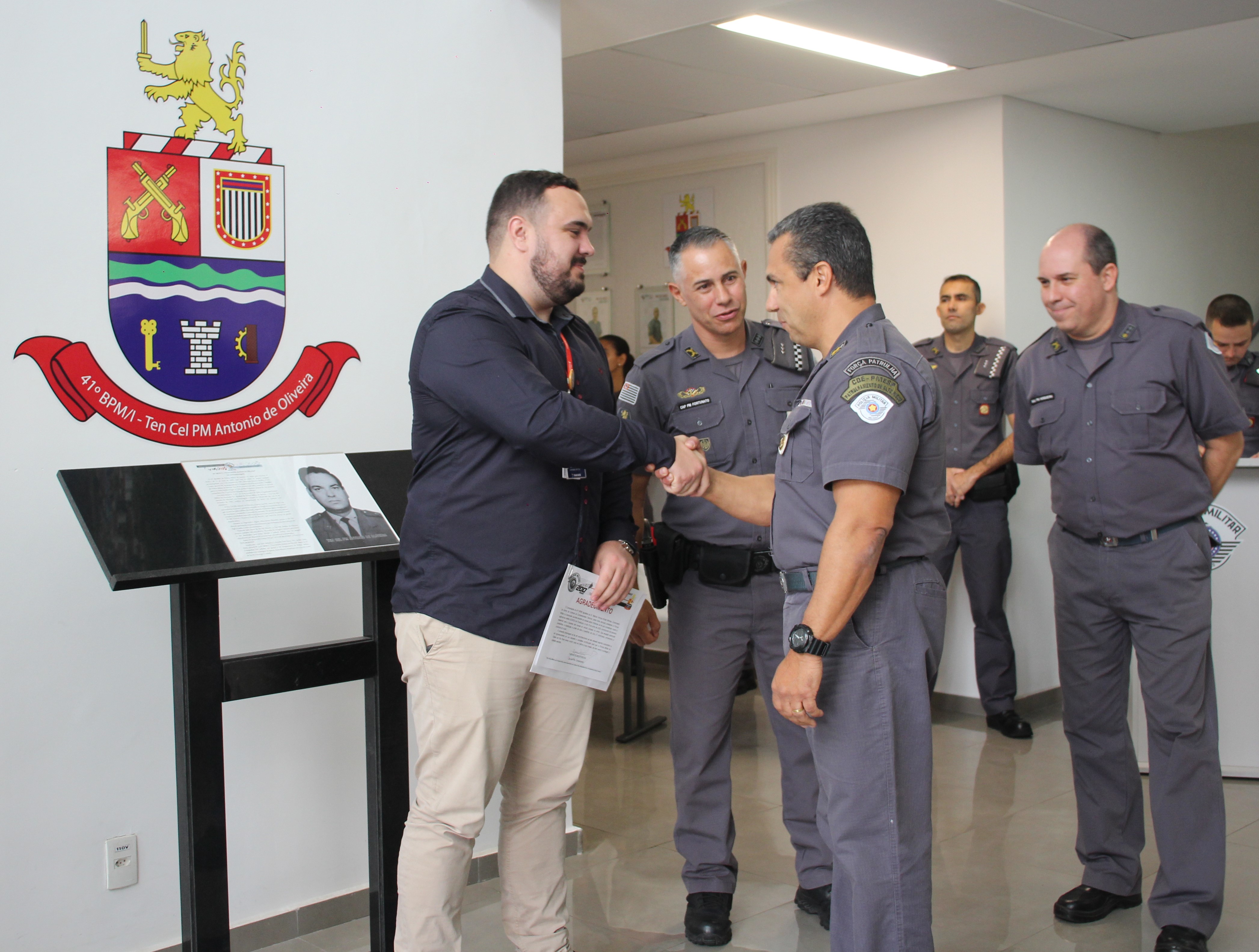 O Controlador de Centro de Controle Operacional (CCO) da Concessionária Tamoios, Marcos Binder, foi homenageado pelo 41º Batalhão da Polícia Militar do Interior (BPM/I) pelos bons serviços prestados à Polícia Militar e à população paulista. A homenagem foi realizada na sede do batalhão, em Jacareí, no último dia 30, durante cerimônia de reconhecimentos da polícia do mês de junho.