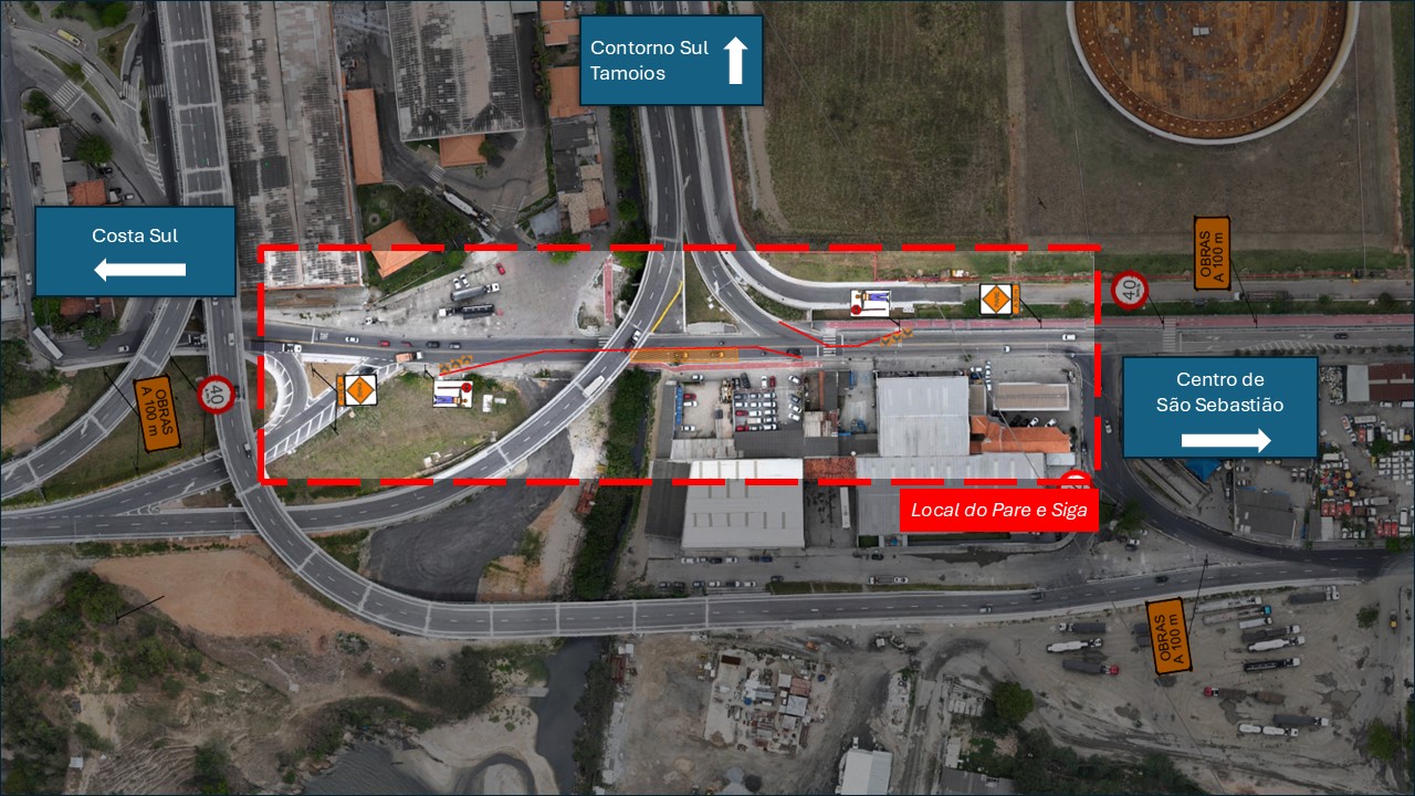 Em virtude da obra do novo acesso ao Porto de São Sebastião, haverá operação pare e siga na via que liga Centro/Contorno Sul Tamoios e Costa Sul/Centro (veja imagem).