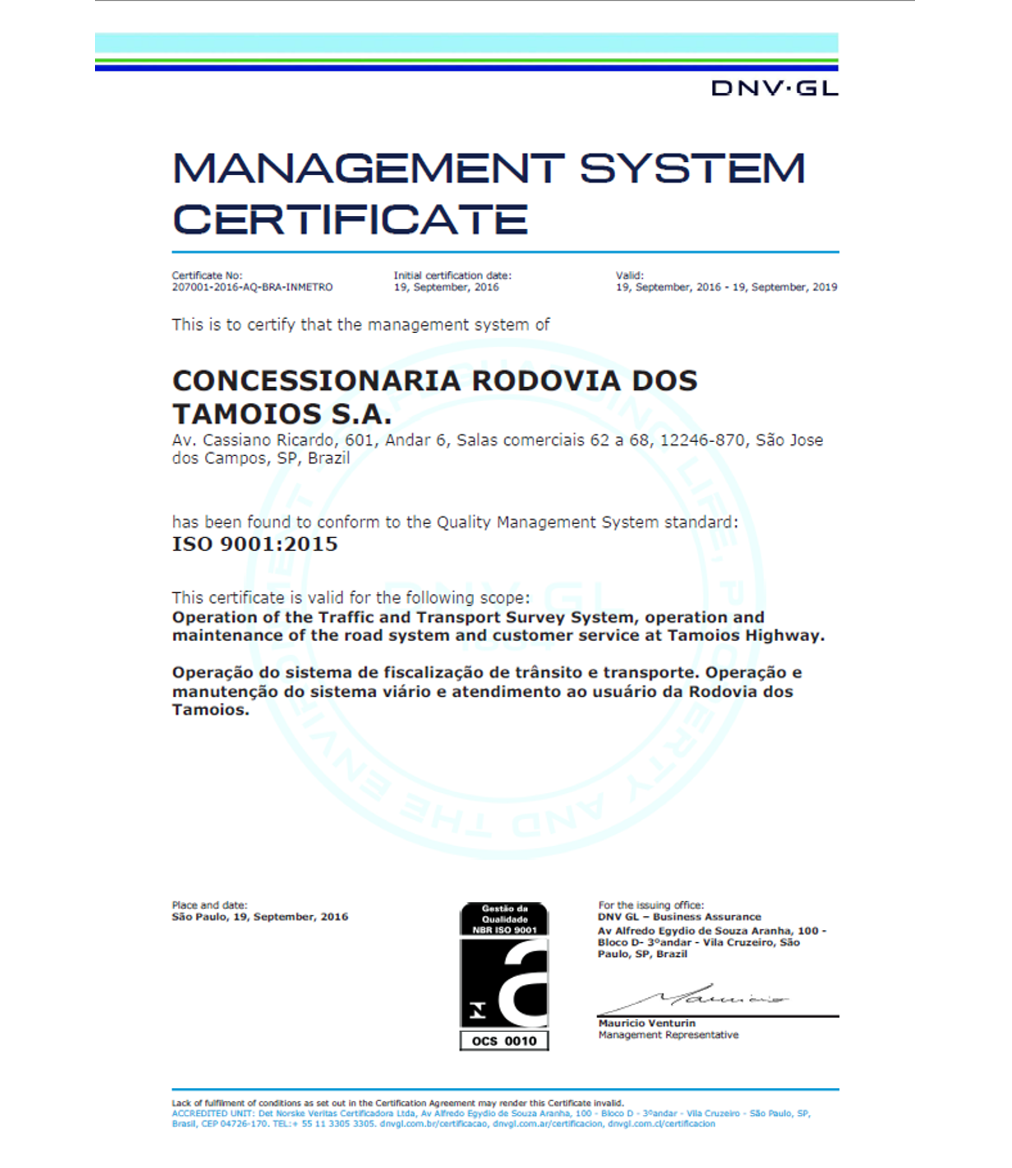 A Concessionária Tamoios agora possui a certificação da Norma ISO 9001:2015. Essa conquista se deu após a implantação do Sistema de Gestão da Qualidade e, posteriormente, com a auditoria externa realizada pela empresa certificadora DNV-GL, no mês de julho/2016, consolidando uma efetiva Gestão da Qualidade em seus processos e serviços.