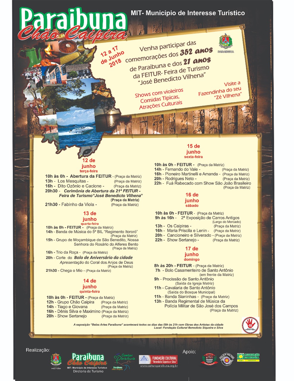 Paraibuna está completando 352 anos e as comemorações acontecem de 12 a 17 de junho. A programação conta com apresentações musicais, barracas de comidas típicas, manifestações culturais e muitas outras atividades. Nesse mesmo período, acontece a 21ª edição da Feitur – Feira de Turismo José Benedicto Vilhena, que reúne produtores e expositores locais com os mais diversos produtos típicos da região.